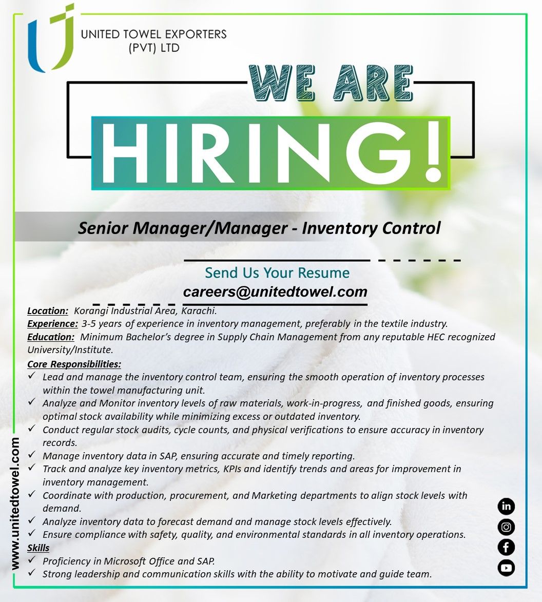 United Towel Exporters Pvt Ltd Jobs Sr Manager / Manager Inventory Control: