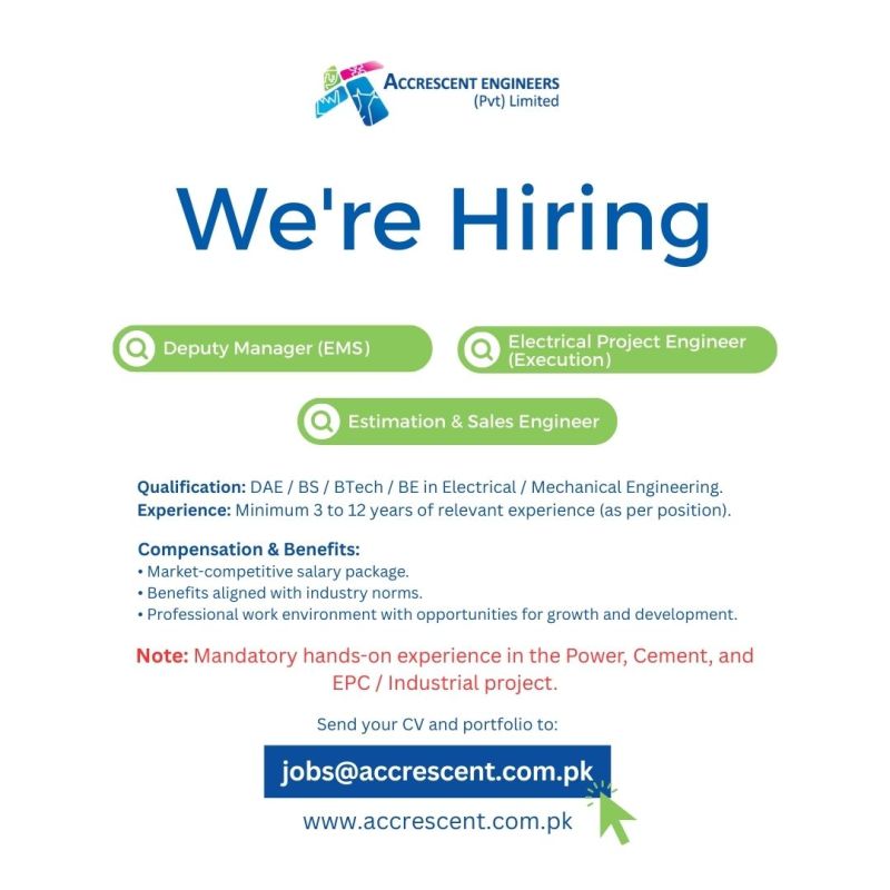 At Accrescent Engineers (Pvt.) Ltd., we deliver large-scale electrical, automation, solar, and infrastructure solutions that power industries and communities. If you are driven by innovation, integrity, and impact, this is where your skills can truly grow.