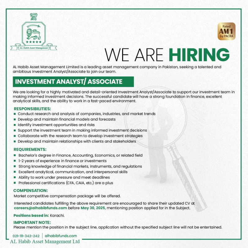 AL Habib Asset Management Limited is a leading asset management company in Pakistan, seeking a talented and ambitious Investment Analyst/Associate to join our team.