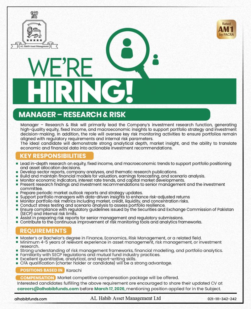 AL Habib Asset Management Limited Jobs Manager Researck & Risk