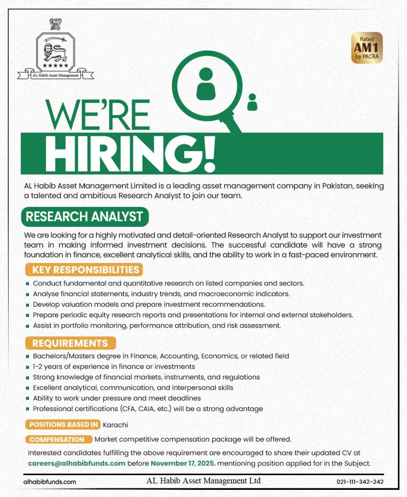 AL Habib Asset Management Limited is looking for a talented and self-driven individual for the position of Research Analyst.