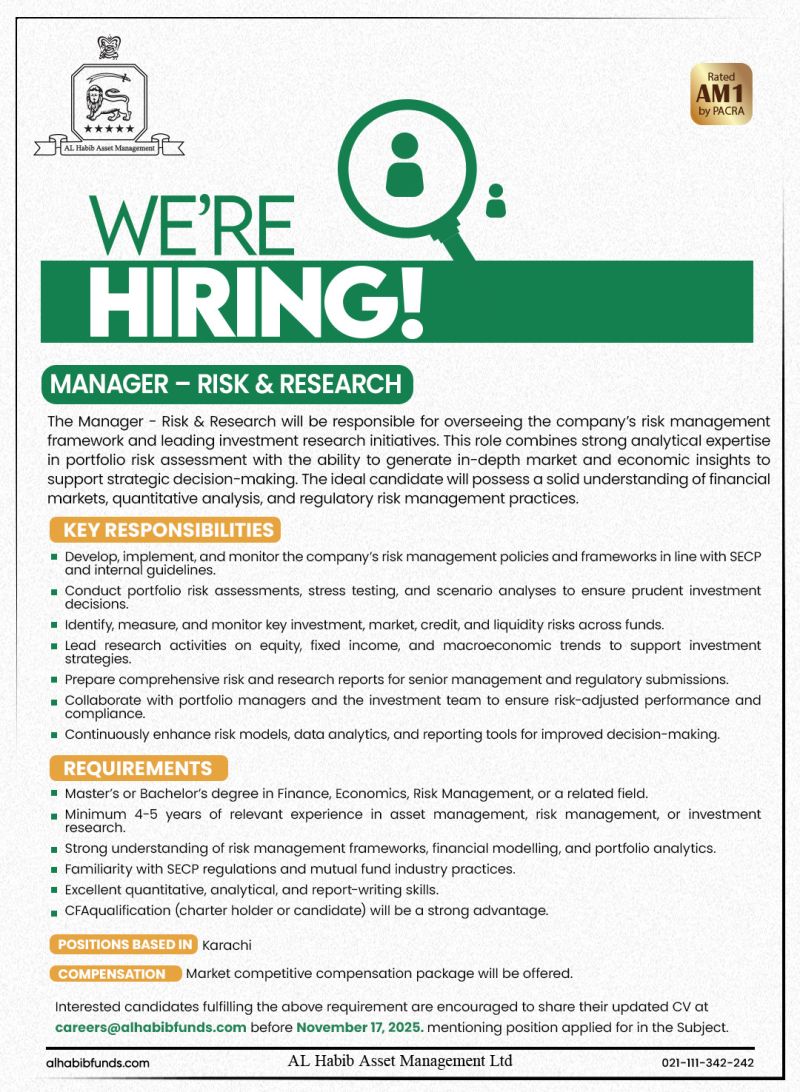 AL Habib Asset Management Limited is looking for a talented and self-driven individual for the position of Manager – Risk and Research.