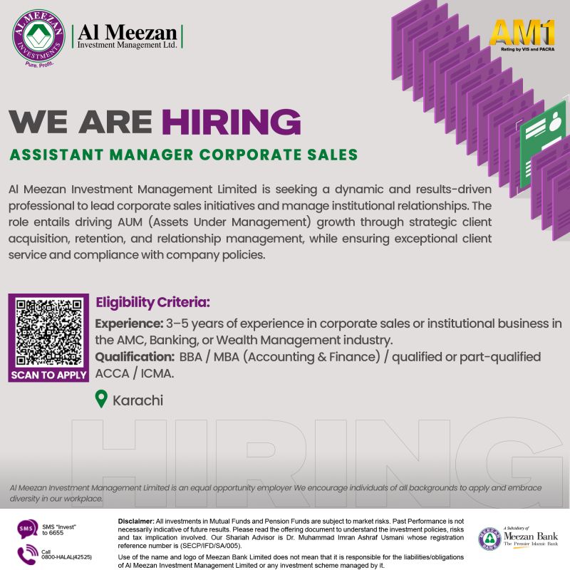 Join us at Al Meezan Investments as an ‘Assistant Manager Corporate Sales ‘ and become part of our dynamic Sales Team.