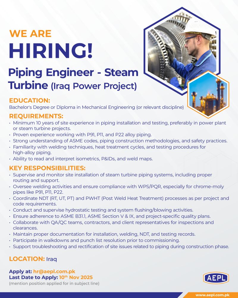 We’re looking for an experienced Piping Engineer – Steam Turbine for our Iraq Power Project. If you have hands-on expertise in piping installation, ASME standards, and steam turbine systems, this is your opportunity to lead impactful projects on an international stage.