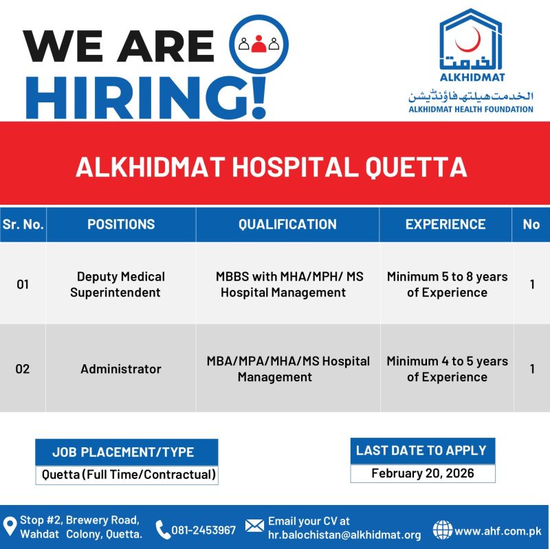 We’re hiring at Alkhidmat Hospital Quetta