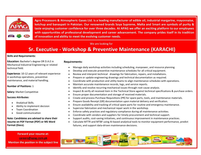 (APAG) Agro Processor Atmospheric Gases Ltd is looking for potential candidates for the position of Sr. Executive Workshop & Preventive Maintenance in Karachi, preferably with experience in the FMCG sector.