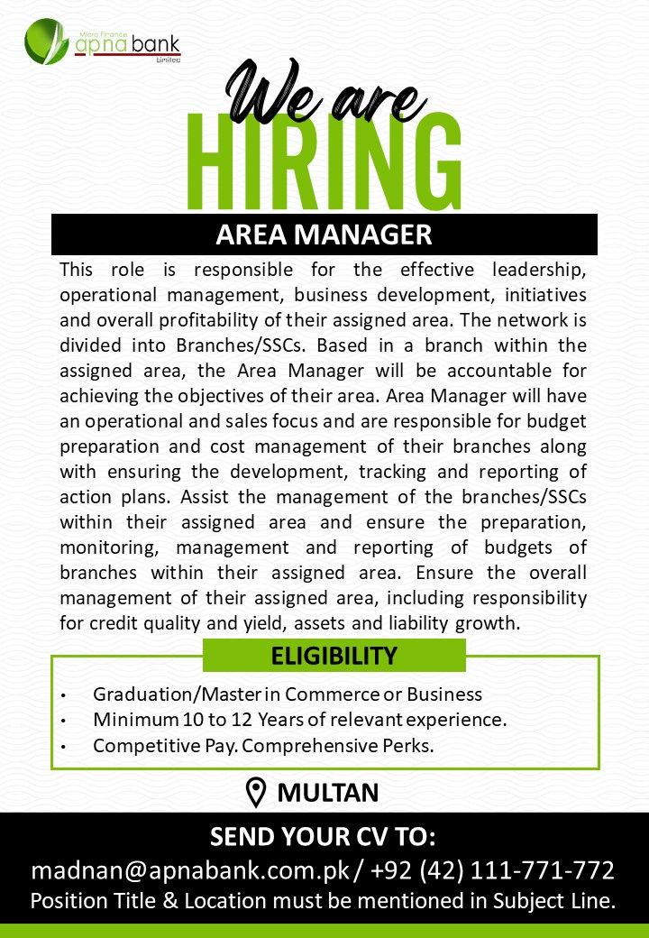 Apna Micro Finance Bank Limited seeking a proactive Area Manager to oversee branch performance, ensure compliance, and drive customer satisfaction across the region.
