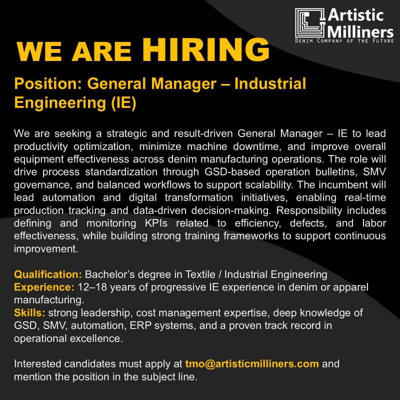 Artistic Milliners Jobs General Manager Industrial Engineering :