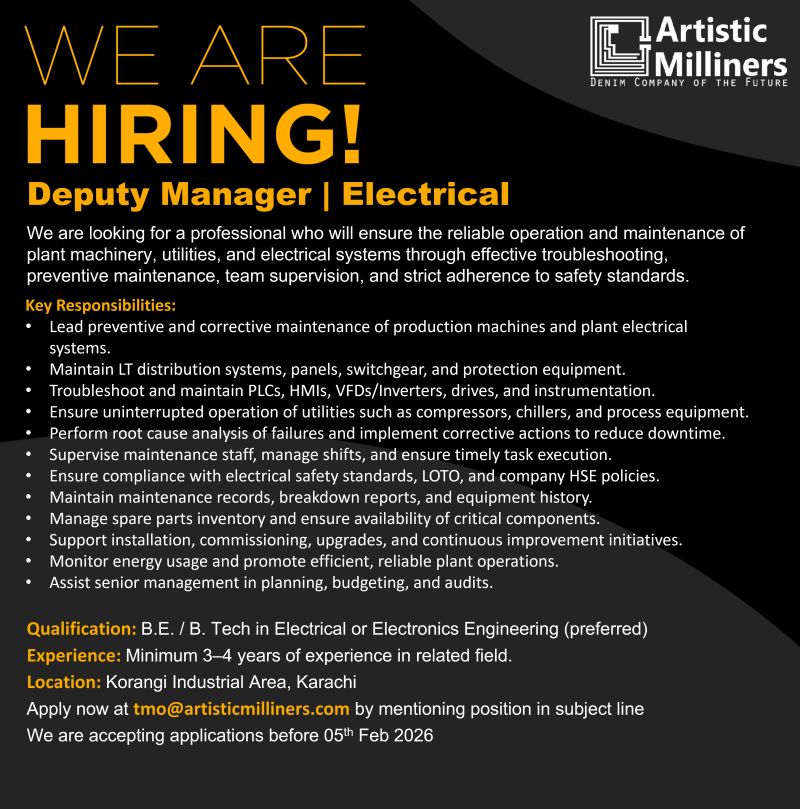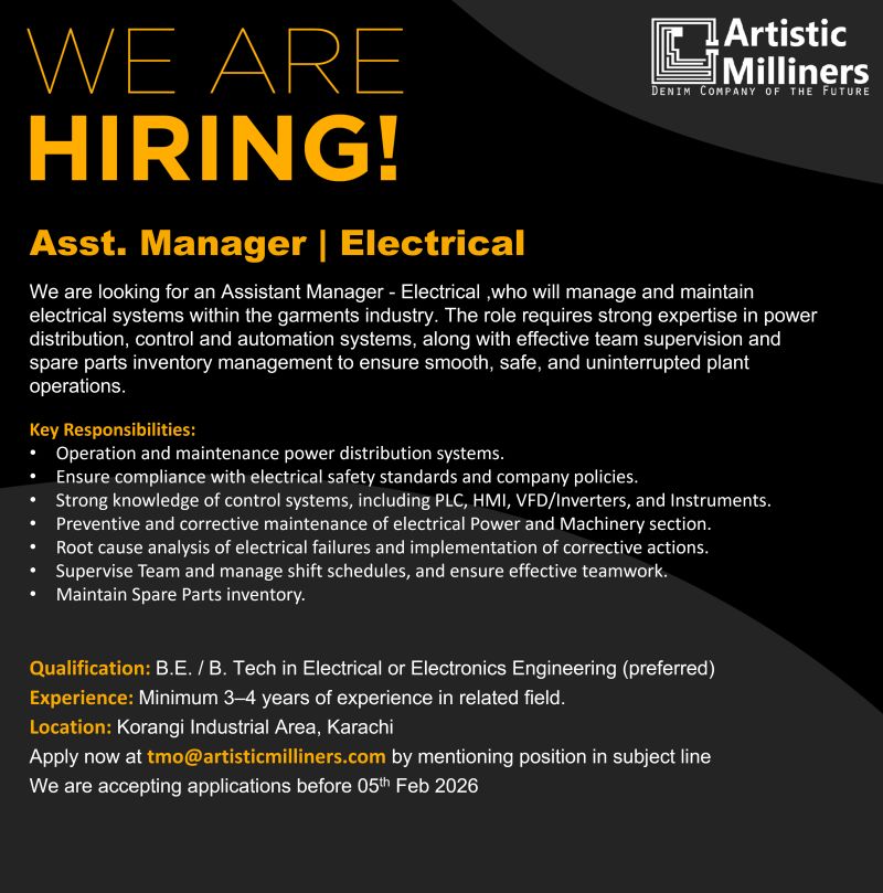 We are looking for an Assistant Manager – Electrical who will manage and maintain electrical systems within the garments industry. The role requires strong expertise in power distribution, control and automation systems, along with effective team supervision and spare parts inventory management to ensure smooth, safe, and uninterrupted plant operations.