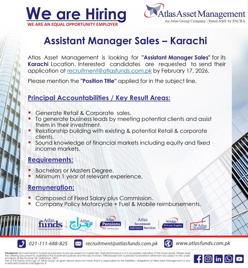 Atlas Asset Management is looking for “Assistant Manager Sales” for its Karachi location. Interested candidates are requested to send their application at [email protected] by February 17, 2026.