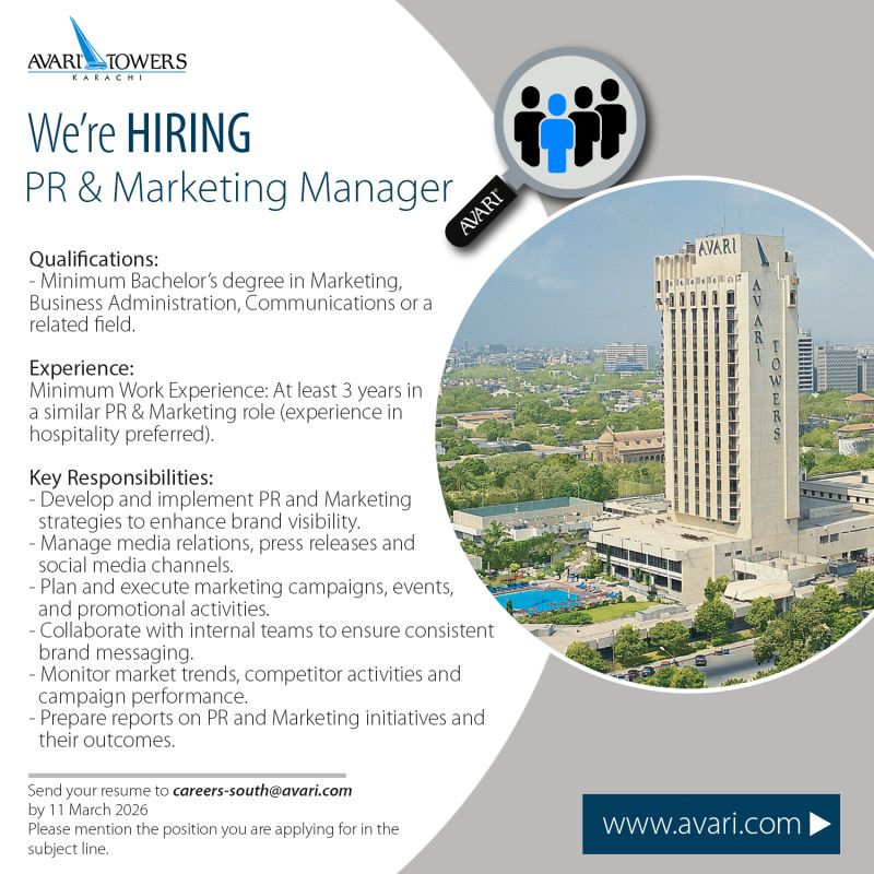 Are you a strategic storyteller with a passion for hospitality? Avari Towers is looking for a dynamic PR & Marketing Manager to join our team in the heart of Karachi.