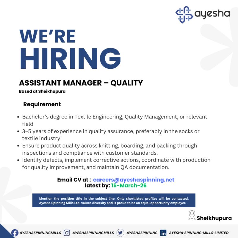 Ayesha Spinning Mills Limited is looking for a talented Assistant Manager – Quality to join our team at our Sheikhupura facility.