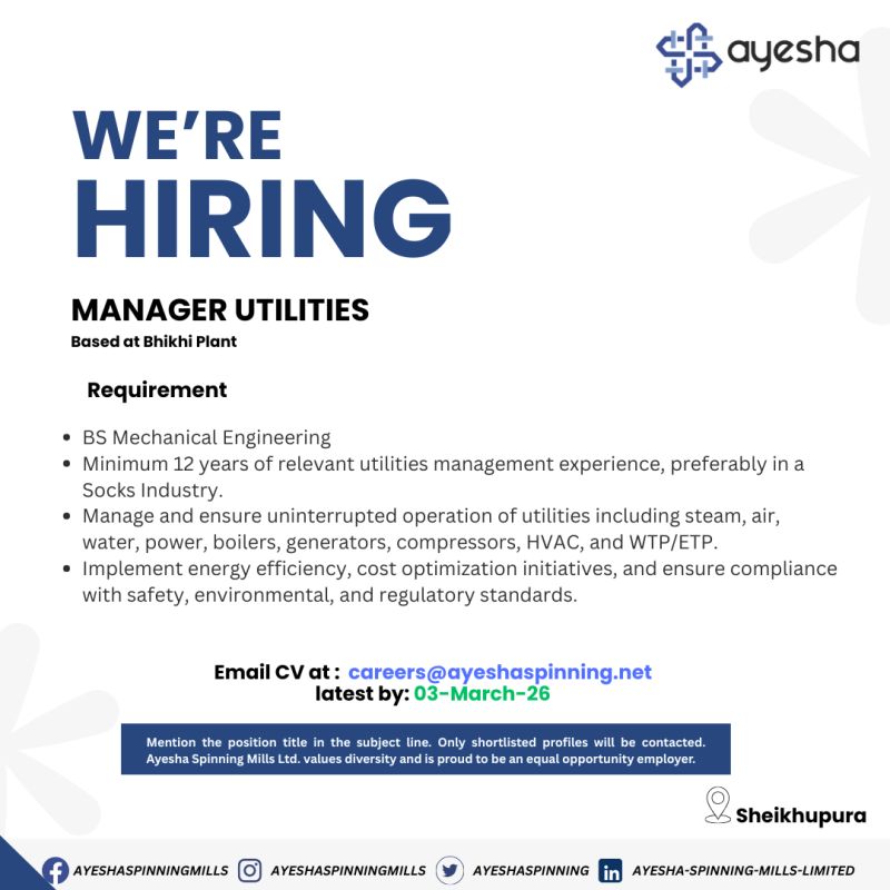Ayesha Spinning Mills Limited is seeking an experienced Mechanical Engineer (12+ years) to lead utilities operations, ensure uninterrupted plant performance, and drive energy efficiency & compliance standards.