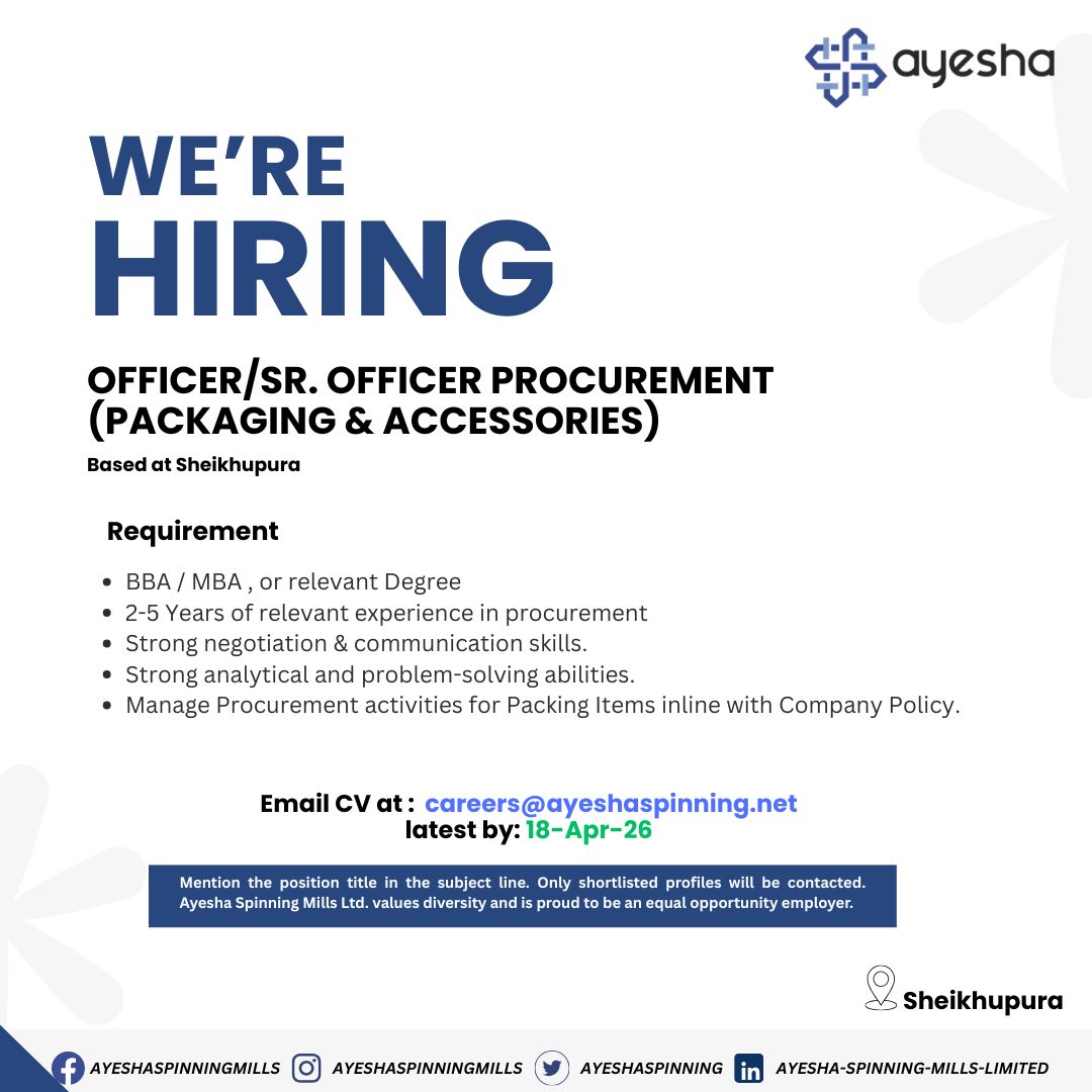 Ayesha Spinning Mills Ltd. is looking for a dynamic and experienced professional to join our team as an Sr. Officer/Officer Procurement (Packaging & Accessories) in our Supply Chain department, Motivated professional for our Sheikhupura location. Strong communication and coordination skills.