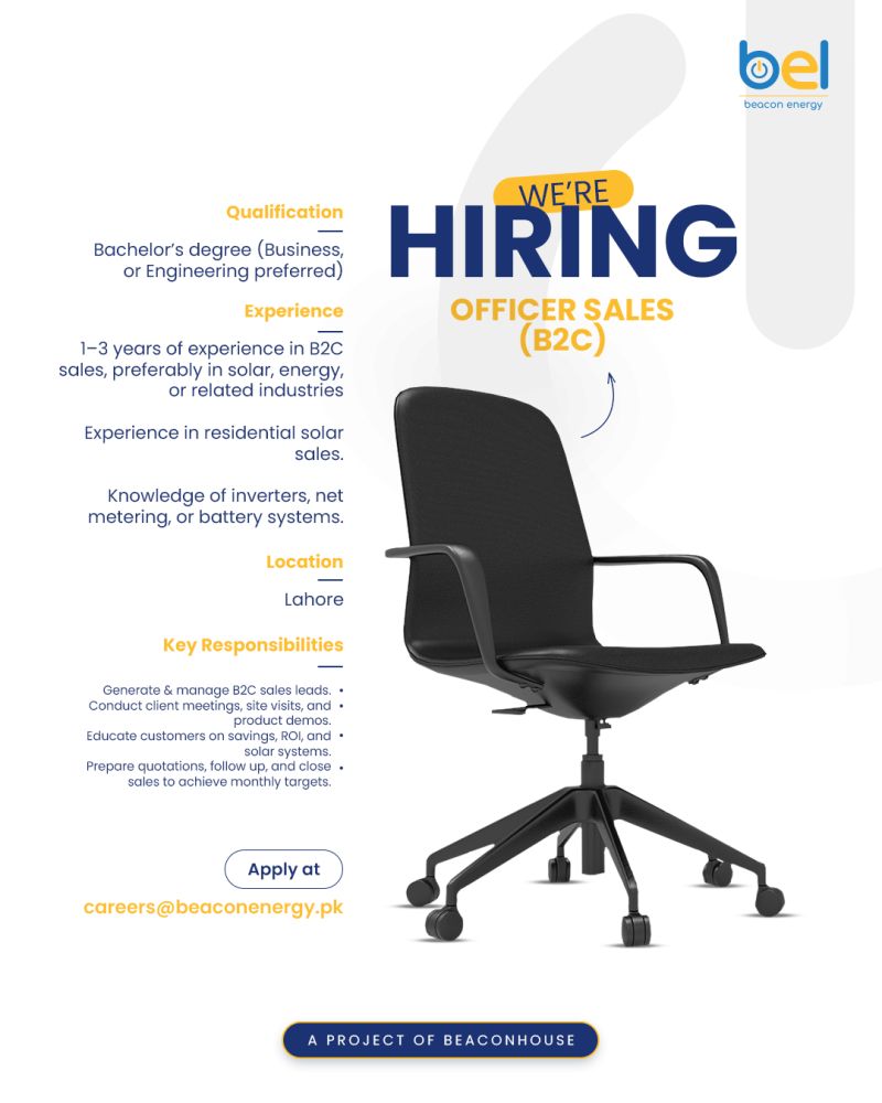 We are hiring an Officer Sales for our B2C team in Lahore. If you have experience in sales, a passion for energy solutions, and the drive to grow in a fast moving industry, we would love to hear from you. Apply now and be part of the future of energy.