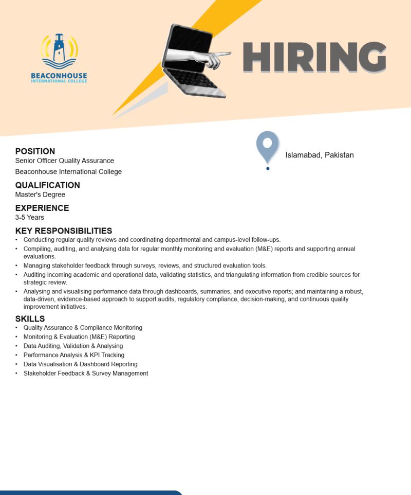 Beaconhouse International College BIC Jobs Senior Officer Quality Assurance :