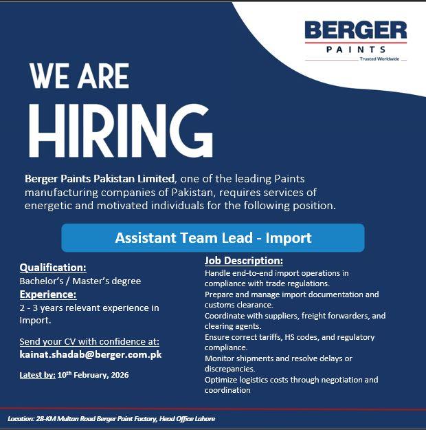 Berger Paints Pakistan is looking for potential candidates for the position of 𝐀𝐬𝐬𝐢𝐬𝐭𝐚𝐧𝐭 𝐓𝐞𝐚𝐦 𝐋𝐞𝐚𝐝 – 𝐈𝐦𝐩𝐨𝐫𝐭 for its 𝐏𝐮𝐫𝐜𝐡𝐚𝐬𝐞 & 𝐏𝐥𝐚𝐧𝐧𝐢𝐧𝐠 department in (𝐋𝐚𝐡𝐨𝐫𝐞). Candidates having relevant years of experience and qualification are encouraged to apply with position title in the subject line of given email: