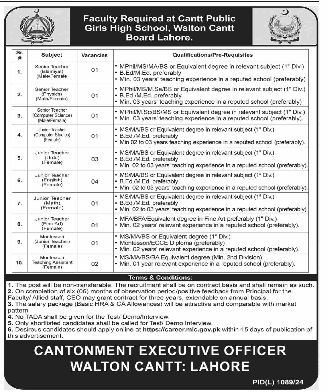 Faculty Required at Cantt Public Girls High School, Walton Cantt Board Lahore