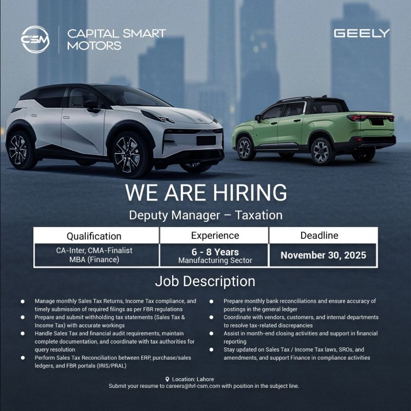 Capital Smart Motors is looking for a Deputy Manager – Taxation
