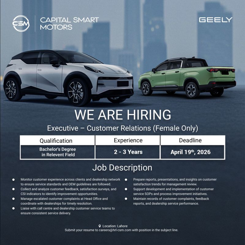 Capital Smart Motors is looking for an Executive – Customer Relations (Female) .