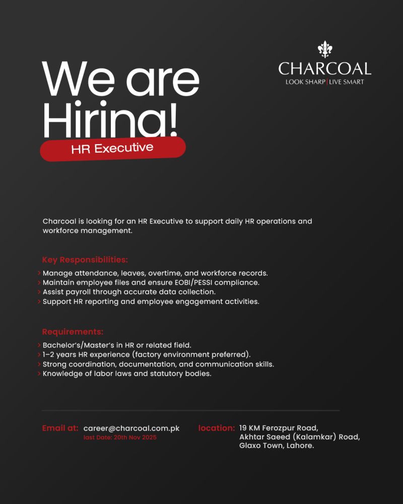 Charcoal is looking for an HR Executive to support daily HR operations and workforce management.