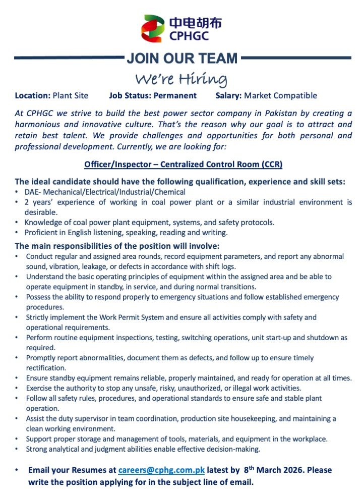 China Power Hub Generation Company CPHGC Jobs Officer/Inspector Centralized Control Room (CCR)  1