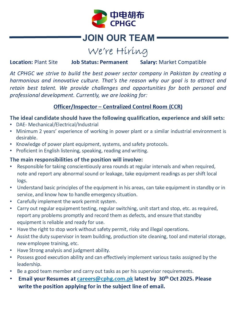 At CPHGC we strive to build the best power sector company in Pakistan by creating a harmonious and innovative culture. That’s the reason why our goal is to attract and retain best talent. We provide challenges and opportunities for both personal and professional development. Currently, we are looking for: