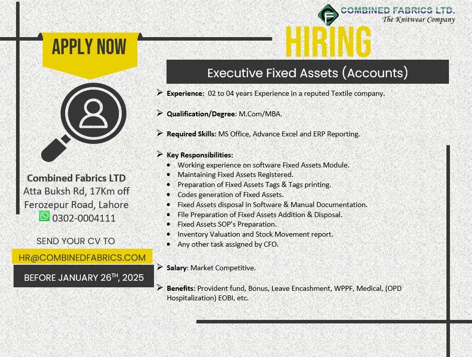 Are you a dynamic and strategic marketer ready to take on new challenges? Combined Fabrics Limited is hiring a “Executive Fixed Assets” in our “Accounts” Department.