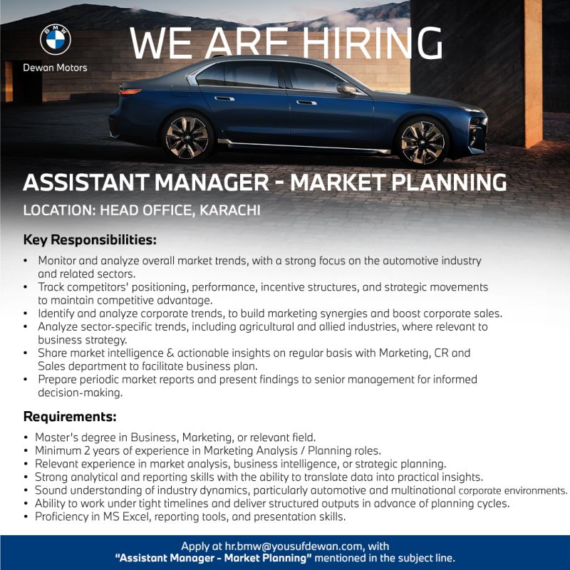 Dewan Motors is hiring a ‘Assistant Manager – Marketing Planning’ to be based in Karachi, Pakistan. If you are confident and passionate about marketing planning and research, we want to hear from you!