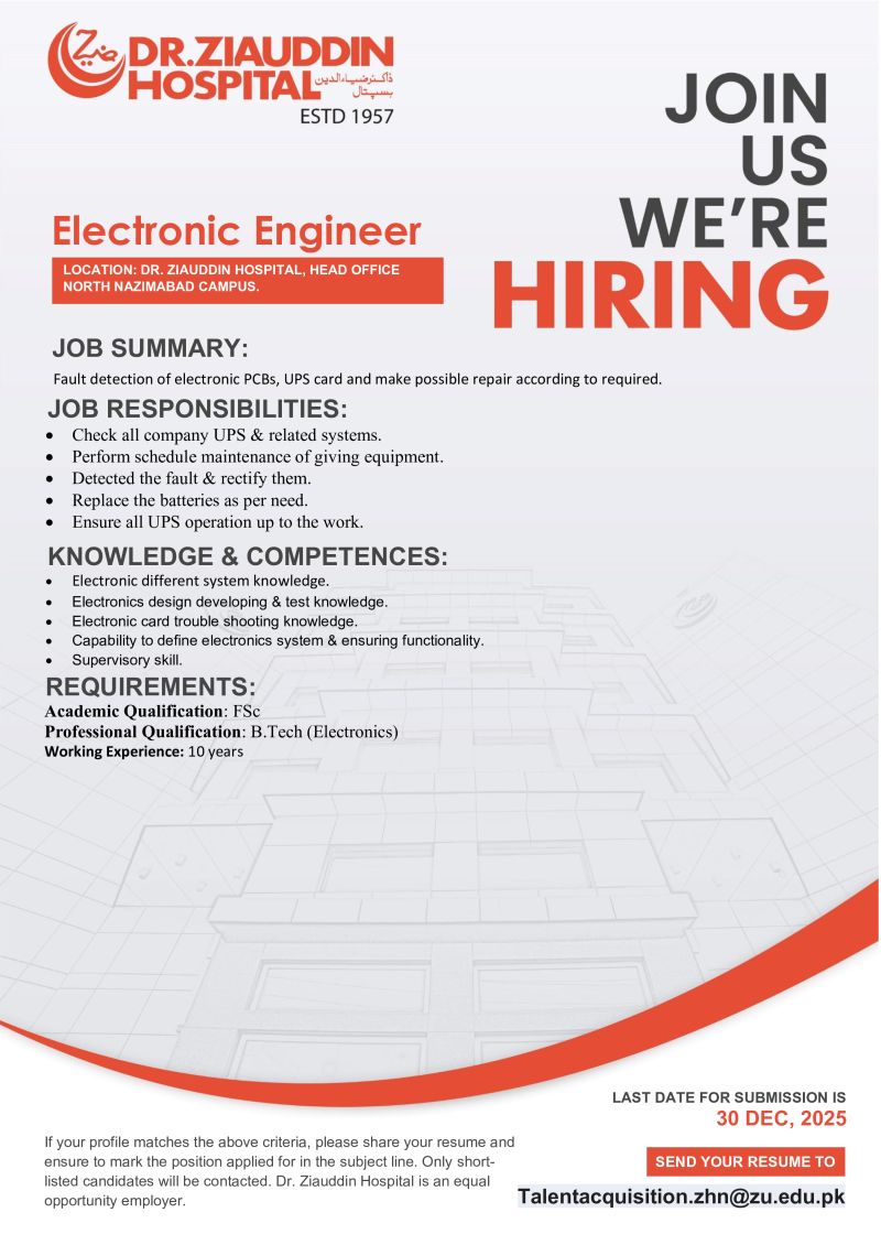 Dr Ziauddin Hospital Jobs Electronic Engineer: