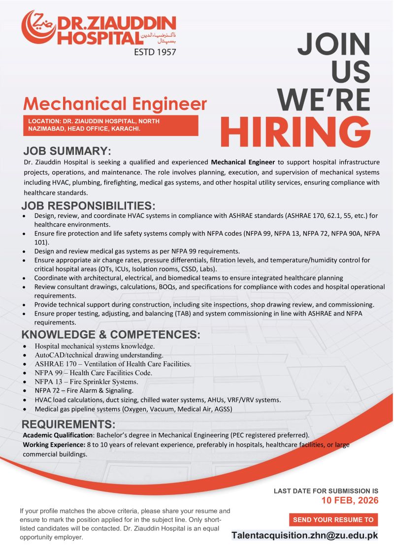 Dr. Ziauddin Hospital is seeking a qualified and experienced Mechanical Engineer to support hospital infrastructure projects, operations, and maintenance. The role involves planning, execution, and supervision of mechanical systems including HVAC, plumbing, firefighting, medical gas systems, and other hospital utility services, ensuring compliance with healthcare standards.