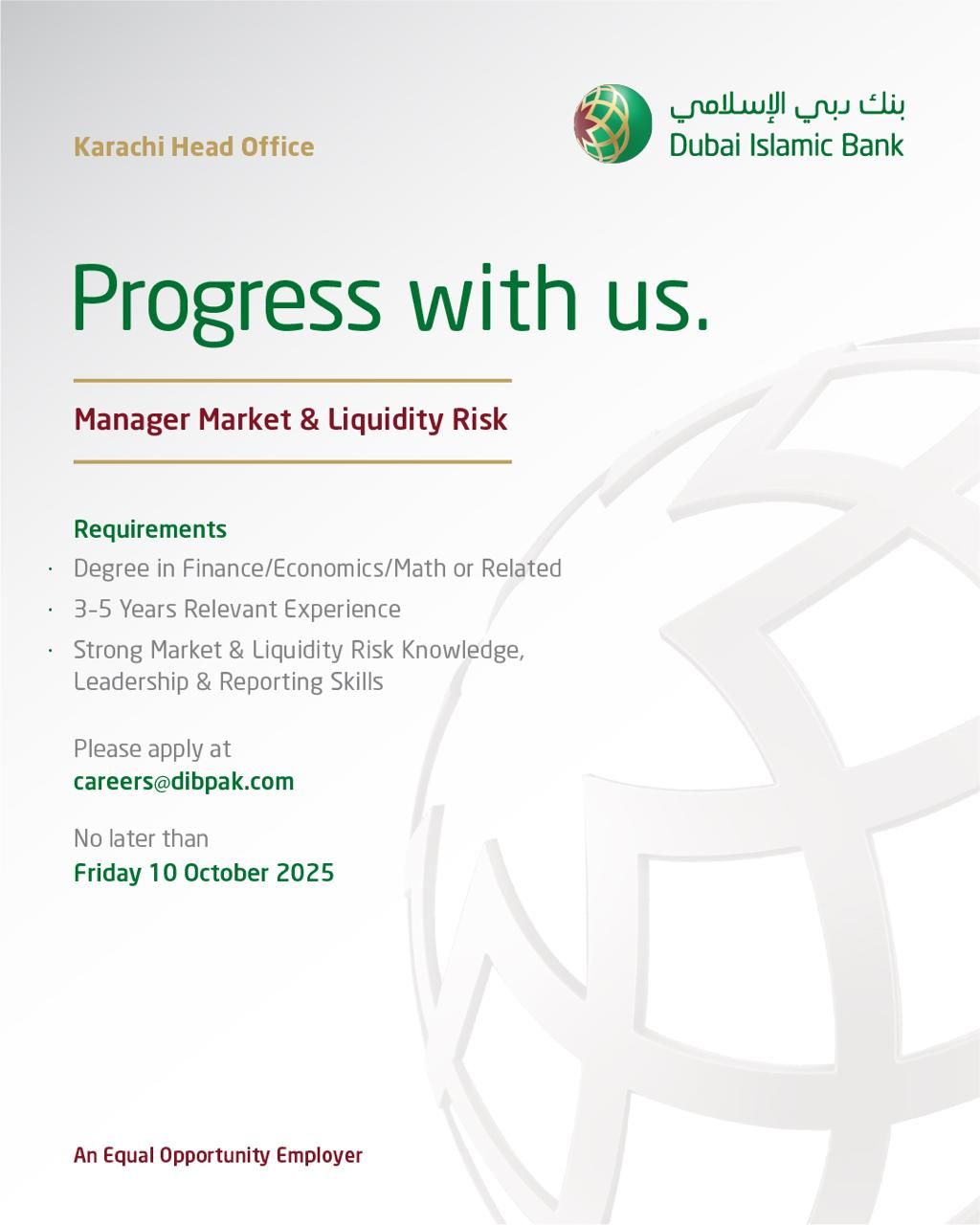 Dubai Islamic Bank is hiring Manager – Market; Liquidity Risk at our Karachi Head Office.