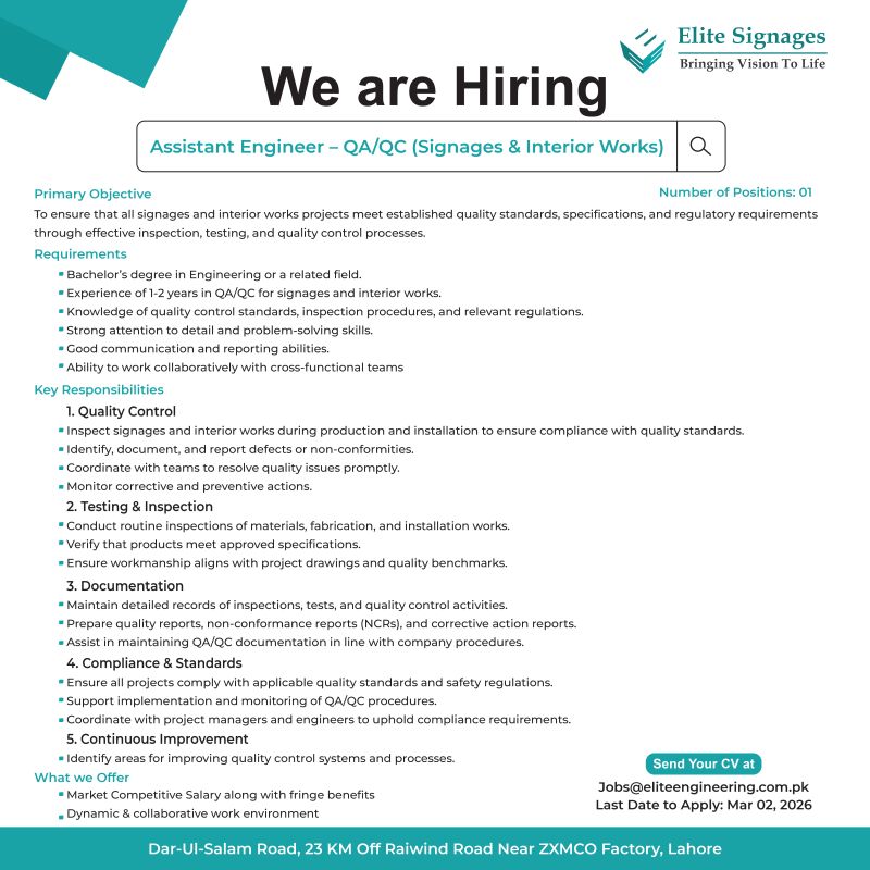 - Assistant Engineer – QA/QC (Signages & Interior Works)