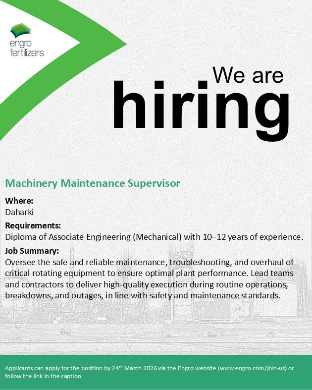 - Engro Fertilizers is hiring a Machinery Maintenance Supervisor, based in Daharki.