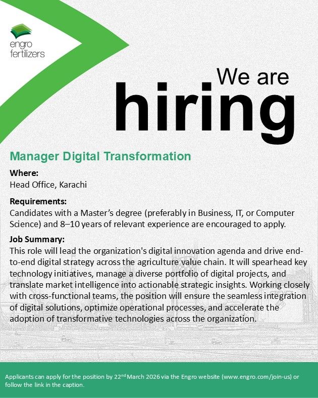 - Engro Fertilizers is hiring a Manager Digital Transformation, based at its Head Office in Karachi.