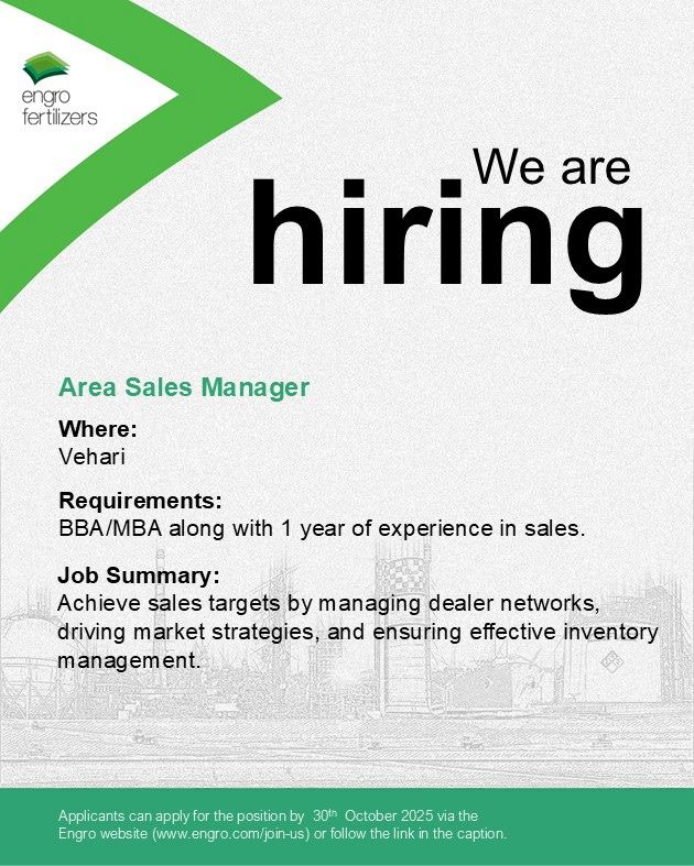 Engro Fertilizers is hiring an Area Sales Manager based in Vehari. The role focuses on achieving sales targets through effective dealer network management, market strategy development, and inventory oversight. It requires strong execution to drive distribution efficiency and ensure target achievement within assigned territories.