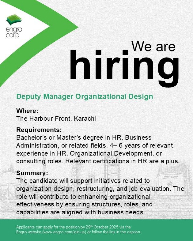 Engro Corp is hiring a Deputy Manager Organizational Design based at The Harbour Front, Karachi. The role supports organization-wide initiatives in design, restructuring, and job evaluation, ensuring structures, roles, and capabilities align with business needs. It also strengthens HR strategy by streamlining operational frameworks to enhance overall effectiveness.