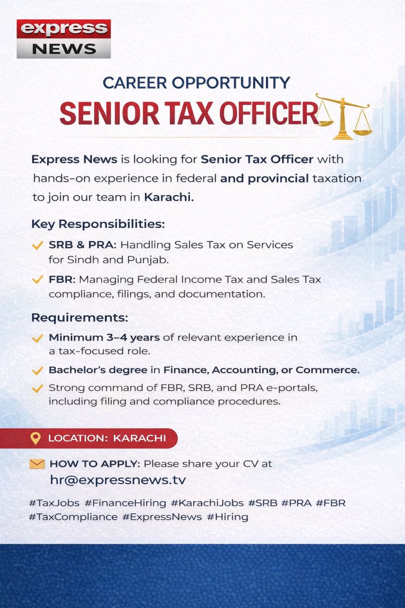 Express News is looking for Senior Tax Officer with strong hands-on experience in federal and provincial taxation to join our team in Karachi.