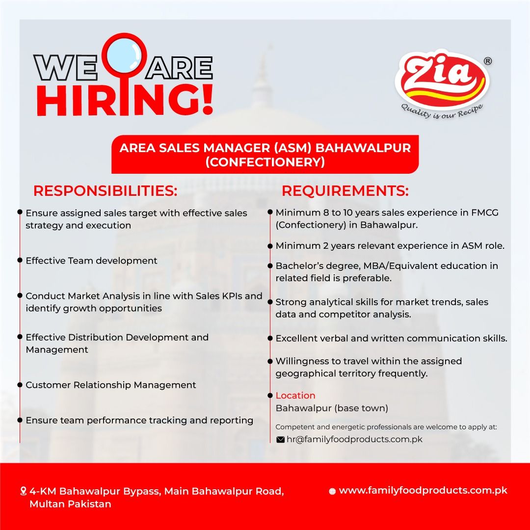 We are inviting applications for the position of Area Sales Manager (ASM) Bahawalpur (Confectionery). Candidates must have relevant working experience in the Confectionery & Snacks industry.