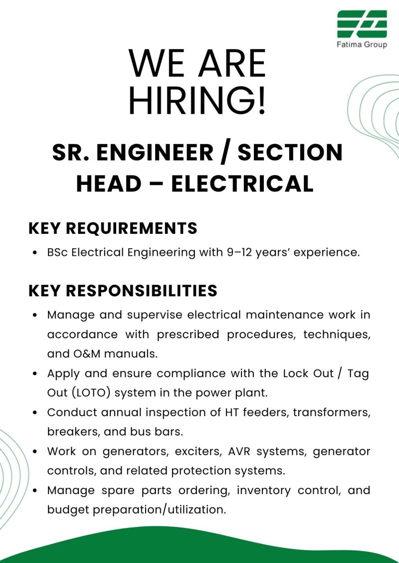 Fatima Group is hiring for Sr. Engineer / Section Head – Electrical at Fatima Energy Limited.
