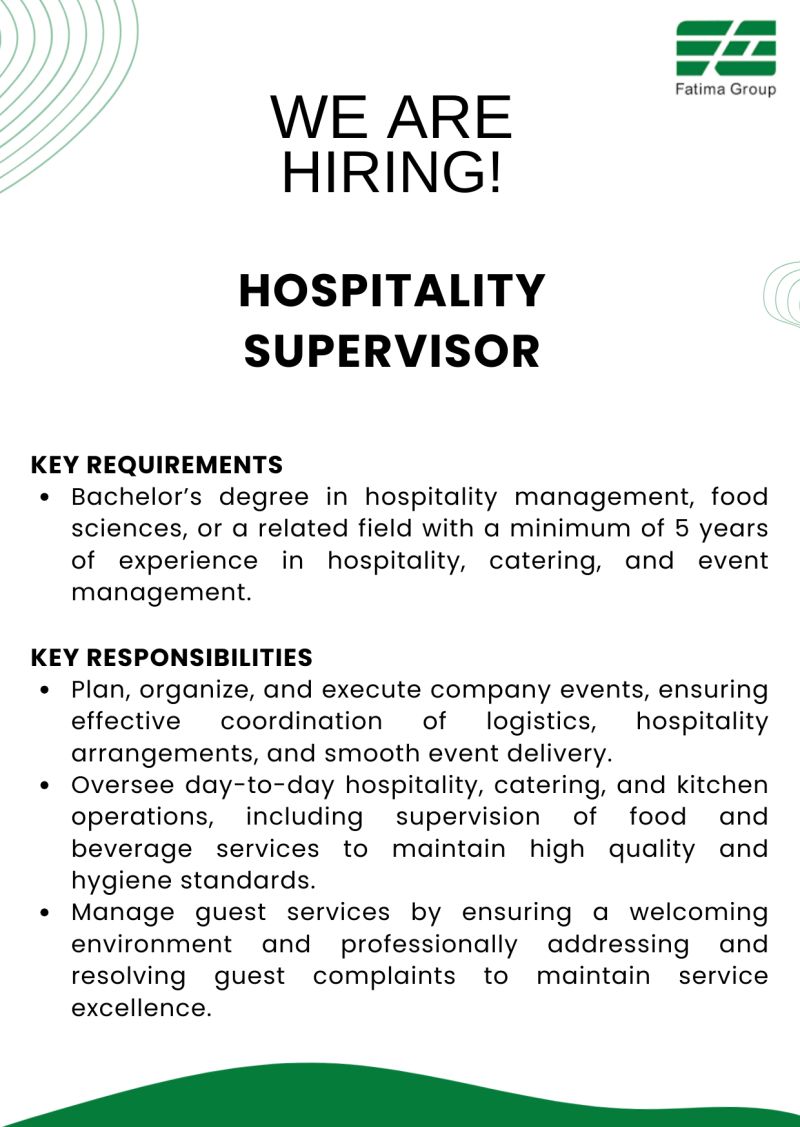 Fatima Group is hiring for Hospitality Supervisor (Contractual).