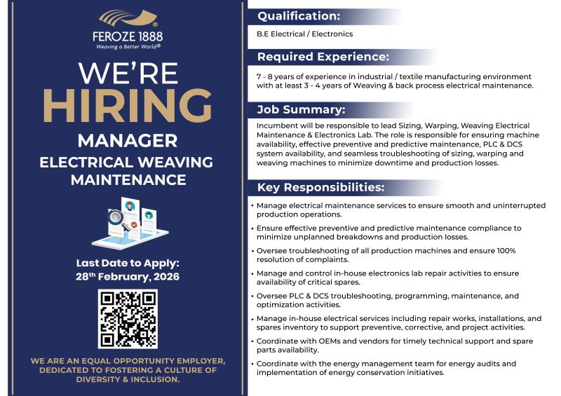 Feroze1888 Mills Ltd. is looking for a dynamic and detail-oriented professional to join our team as 𝘔𝘢𝘯𝘢𝘨𝘦𝘳 – 𝘌𝘭𝘦𝘤𝘵𝘳𝘪𝘤𝘢𝘭 𝘞𝘦𝘢𝘷𝘪𝘯𝘨 𝘔𝘢𝘪𝘯𝘵𝘦𝘯𝘢𝘯𝘤𝘦. This is your opportunity to become part of a purpose-driven organization dedicated to Weaving a Better World.