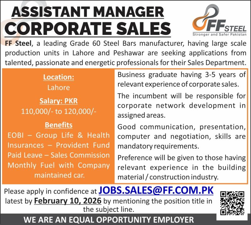 Pakistan’s Largest Selling Steel Bars Brand is looking for an Assistant Manager – Corporate Sales to join our dynamic team in Lahore.