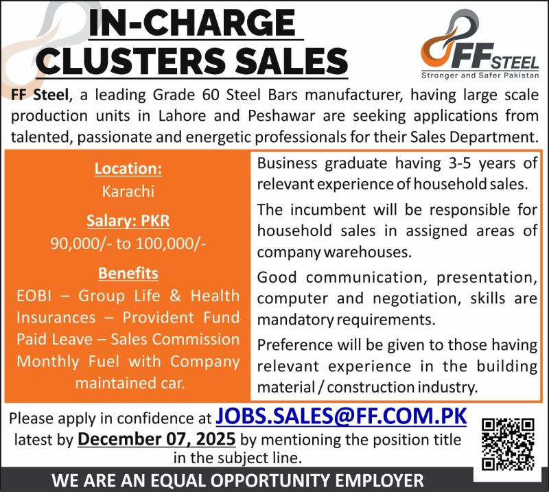 FF Steel, a leading Grade 60 Steel Bars manufacturer, having large scale production units in Lahore and Peshawar are seeking applications from talented, passionate and energetic professionals for their Sales Department.