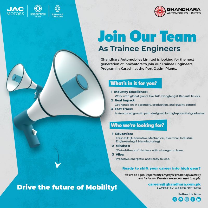 Ghandhara Automobiles Limited is looking for the next generation of innovators to join our Trainee Engineers Program in Karachi at the Port Qasim Plants.