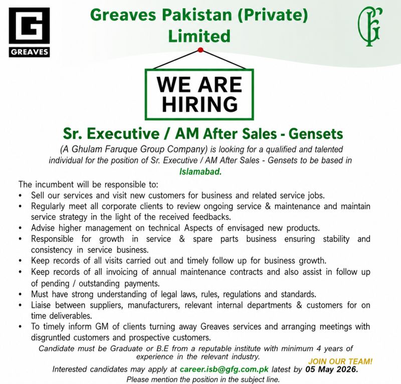 Greaves Pakistan (Private) Limited Jobs Sr Executive / AM After Sales Gensets: