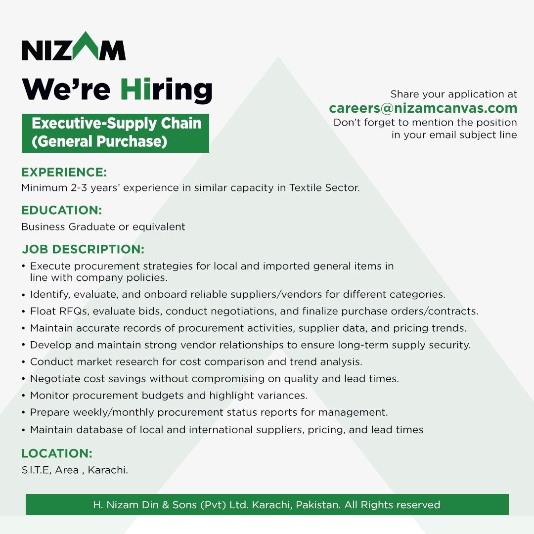 H. Nizam Din & Sons (Pvt) Ltd Jobs Executive Supply Chain (General Purchase):