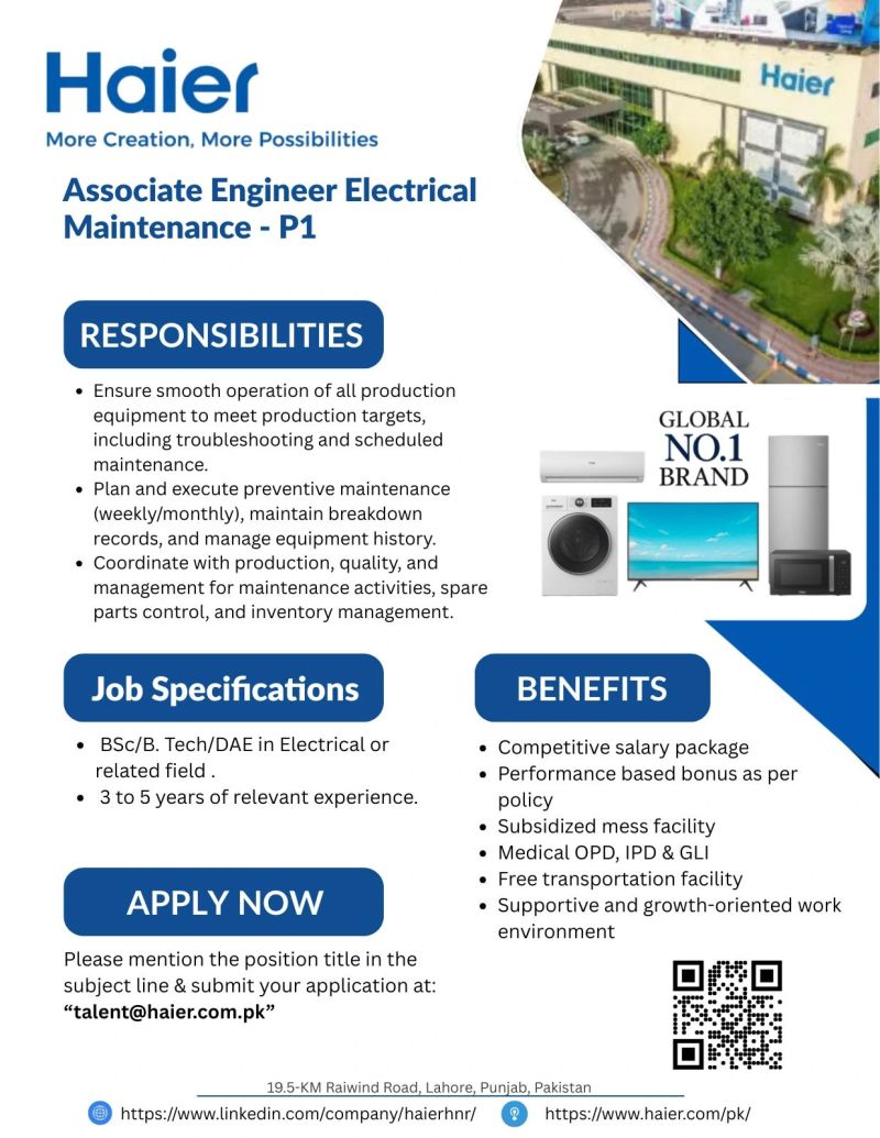 Haier Pakistan Jobs Associate Engineer Electrical Maintenance (P1) 1