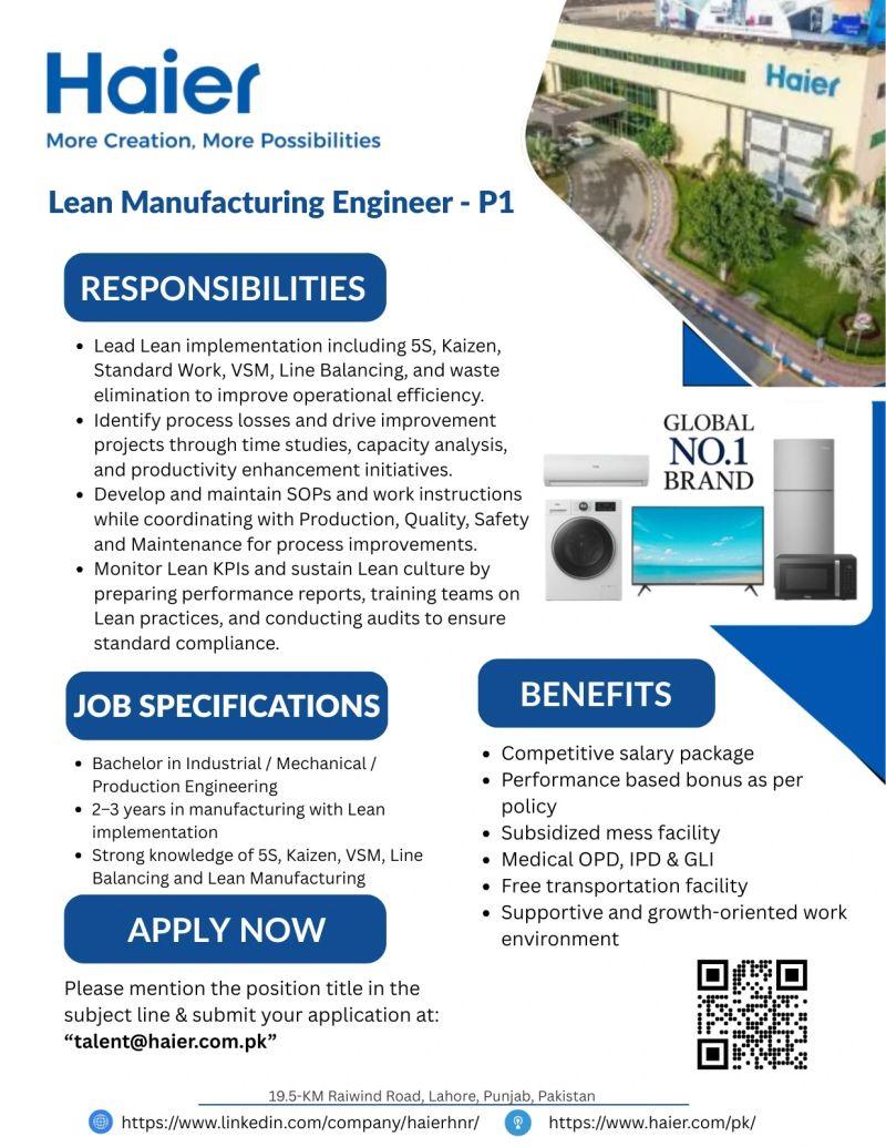 Haier Pakistan Jobs Lean Manufacturing Engineer (P1):