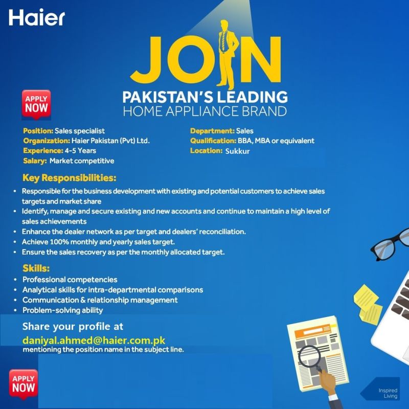 Haier Pakistan Pvt Ltd Jobs Sales Specialist :